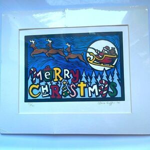 New in packaging print of Santa in sleigh with reindeer & moon in background with “Merry Christmas” across lower half with mat