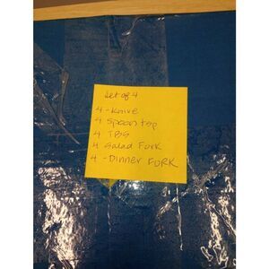 service for four/ 16 pieces total. In original box with silverware still wrapped in plastic. Pieces included in each set is in photos.