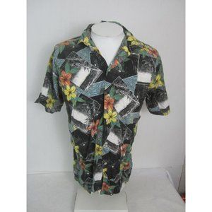 Hawaiian style camp shirt; print features block style with tropical flowers and palm trees
