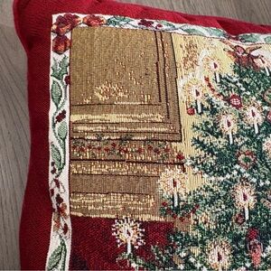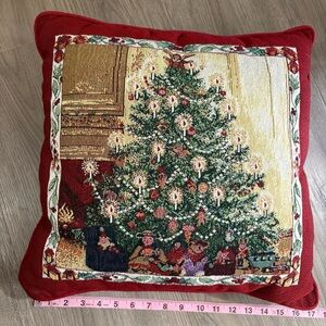 Newport Needlepoint Tapestry Throw Pillow Christmas Tree Vtg Toys Red 17”x17”