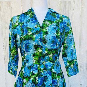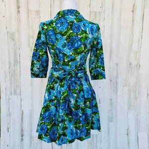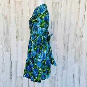 Newport News Dress Womens 4 Blue Green Watercolor 3/4 Sleeve Tie Button Front