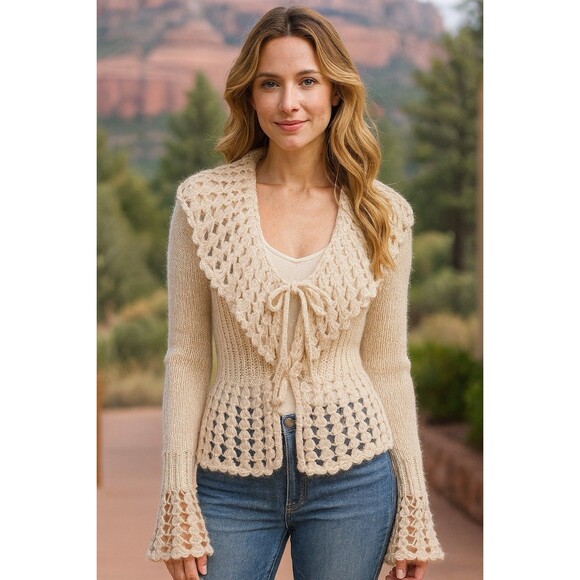 Newport News Off-White Tie-Front Flare Sleeve Knit Cardigan Fairy Whimsy Size L