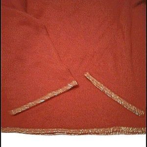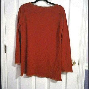 Dark orange long sleeve sweater with golden accents on the collar, sleeves and bottom hems. Scoop neck. Fabric is 90% acrylic and 10% metallic yarn.