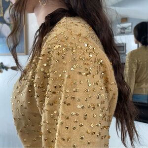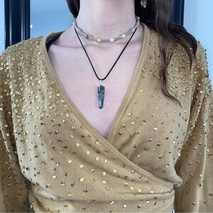 Newport News Womens V-Neck Long Sleeve Sequins Wrap Top Blouse Brown Size XL