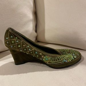 Newport News green handmade embroidery high wedge heels shoes sz 8