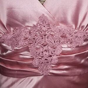 Glamorous Hollywood style low back silky dress with rouging and lace detail by Newport News in mauve