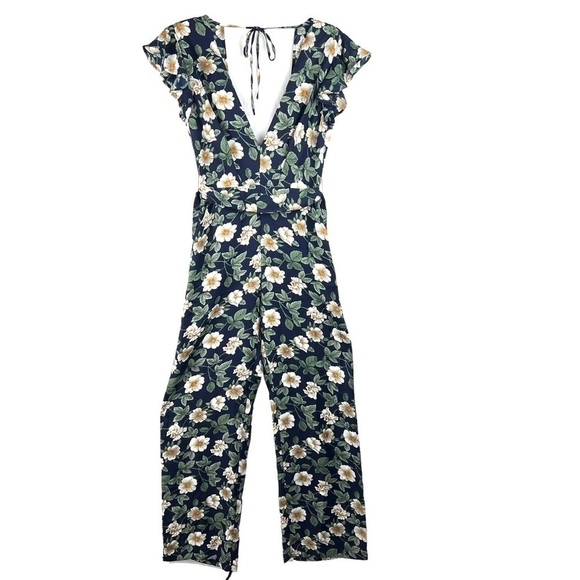 New-shop17 Floral Print Deep V-neck, Open Tie Back, Wide Leg One Piece Jump Suit