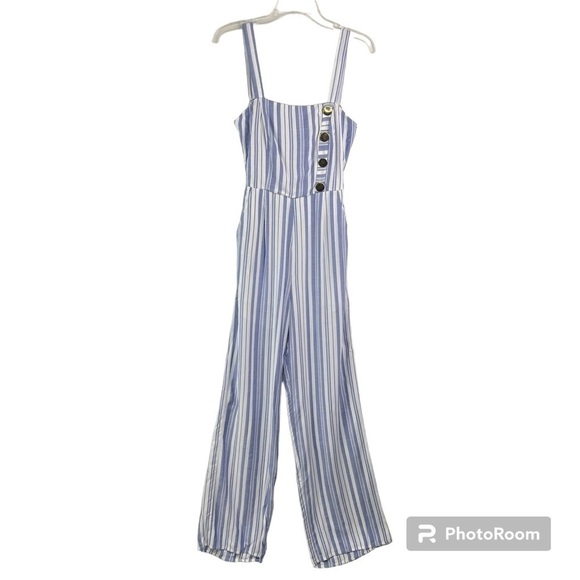 Brand new. Never worn. No tags. This light purple and white, Multi width vertical striped Jumpsuit from Shop17 is figure flattering, edgy and trendy.