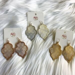 Necklace is 34" long lightweight with larger closure and adjustable chain zinc alloy and the earrings are approx 2" both shipped on cards and packed in wrappers.