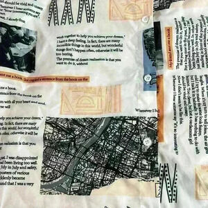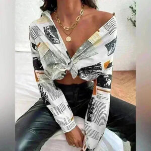 Newspaper All over Print Slogan Collared Button Front Drop Shoulder Blouse, L