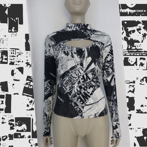 Newspaper Graphic Long Sleeve, High Neck, Cut Out At Chest Top