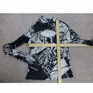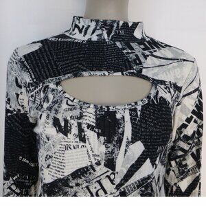Description: Pre-Owned and still in good condition. Long Sleeves. High Neck. Cut out at chest. Newspaper graphic all around.