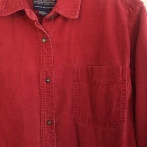 Vintage 80s Newton Trading Co. Pinwale Corduroy Button Front Long Sleeve Shirt in Red with Left Chest Pocket. Made in Hong Kong.
