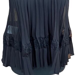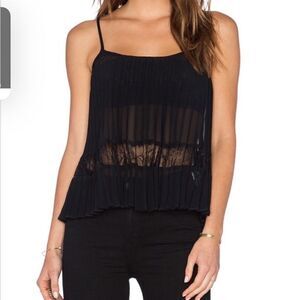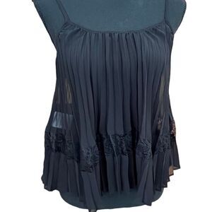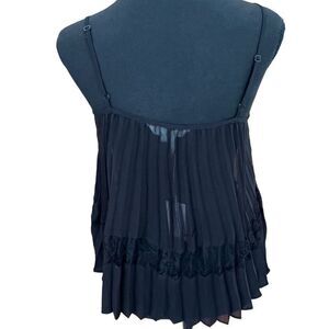 New with tags BCBGeneration Pleated Black Top with lace insert size XS. Adjustable spaghetti straps, semi sheer pleated body, loose fit. 100% polyester. Approximate measurements are pit to pit 16.5”, length from shoulder approximately 22”.