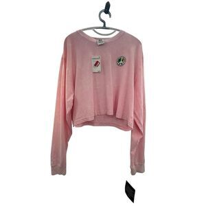 Pink long sleeve crop top by Cross Colours featuring a large multicolor peace sign graphic on the back with “Black Lives For Peace” and “Cross Colours” text. Lightweight with ribbed cuffs and a relaxed fit. Tag still attached. Size large