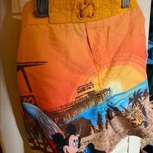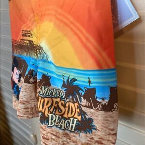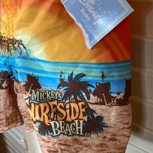 New with tags Disney baby swim trunks, size 12 months in a vibrant orange and yellow and blue featuring a beach scene with goofy Donald and Mickey