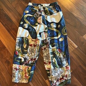 New with tags E-Retro Linen feel pants (65% polyester, 35% cotton). Pull on elastic waist, Inseam 22”; tapered ankle. Such a fun design! No size markings but would say Med/Large.