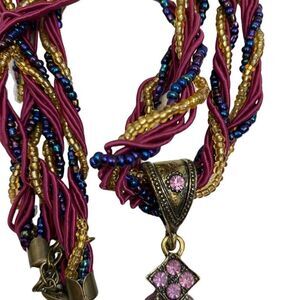 The 16-20 inch beaded necklace is accompanied with an wine red rope, blue and gold glass beads, and is equipped with a lobster clasp for a secure closure.