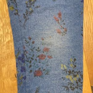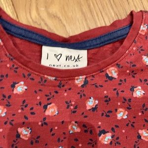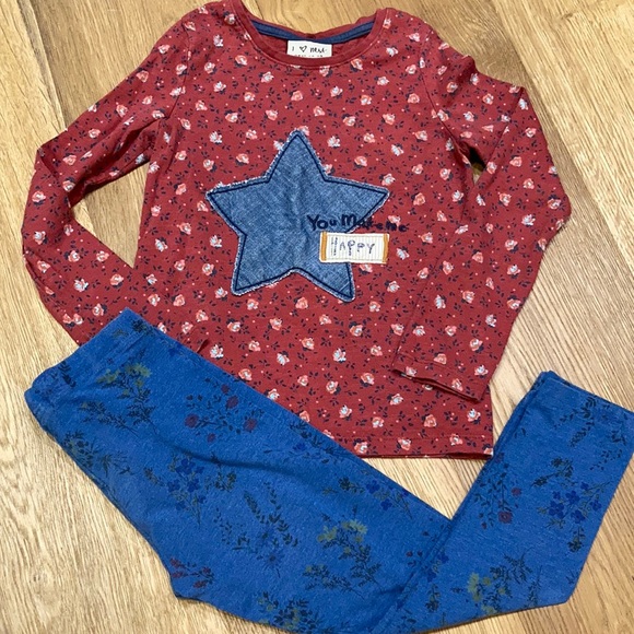 Adorable!long sleeved tee YOU MAKE ME HAPPY” in a deep reddish color floral. Paired with faded blue floral leggings (note faded knees from wear) From a smoke & pet free home.