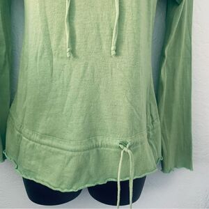 Cute mint green boho top. V-neck with tie lace trim & cream floral embroidery. Drawstring tie at waist. Long bell sleeves. Lettuce style trim on sleeves and waistline. Lightweight polyester/cotton fabric. Some minor pilling on front chest and back also a very faint spot on lower front waist. Please see all photos for details. Next Era Size Small