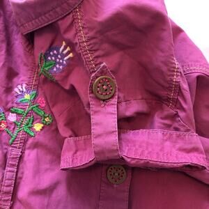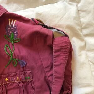 Dark pink dress with embroidered accents. Threaded decorative buttons down front. Cap sleeves with shoulder button tabs. In good used condition.