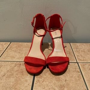 Next Heeled Sandals in red. Adjustable ankle strap. Women's size UK 6.5/ US 8.5. Dirt marks to the front strap and back of heels, but structurally good condition.