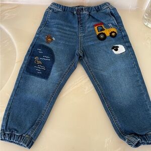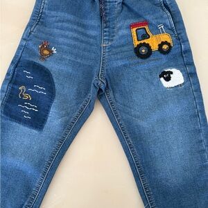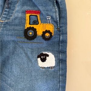 Charming blue jeans with farm-themed embroidery. Features a tractor, chicken, and sheep. Fun and comfortable for kids.