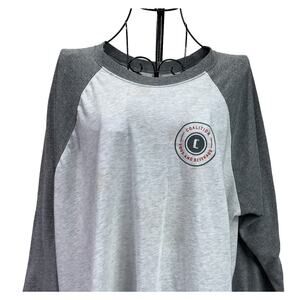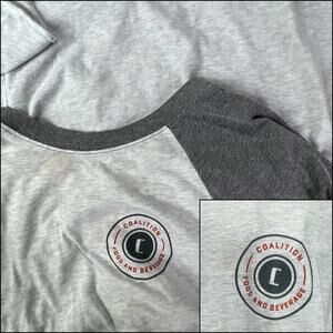 Men's Women's 3/4 raglan sleeve jersey tee shirt top from Next Level in heathered light gray with heathered dark gray sleeves and neckline. Nostalgic wardrobe staple. Crew neck. SIZE LARGE. Emblem on front reads: Coalition Food and Beverage. Great outdoor work or play shirt. Due to light & screen variations, colors may vary slightly from the images