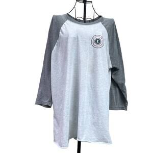 Men's Women's 3/4 raglan sleeve jersey tee shirt top from Next Level in heathered light gray with heathered dark gray sleeves and neckline. Nostalgic wardrobe staple. Crew neck. SIZE LARGE. Emblem on front reads: Coalition Food and Beverage. Great outdoor work or play shirt. Due to light & screen variations, colors may vary slightly from the images
