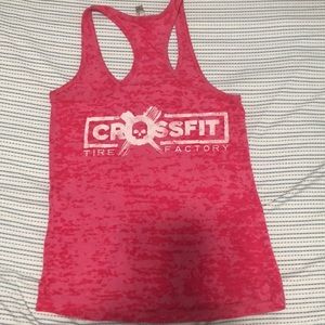 Back design has skull and says “Crossfit Tire Factory” in white ( See pic)