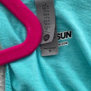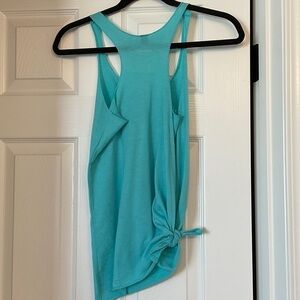 Sleeveless racerback muscle tank. Turquoise knit with avocado graphic on front. Soft, lightweight fabric. Casual, summery look. Cut on bottom left to tie. It’s a long shirt.