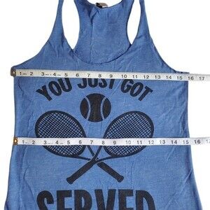 Brand: Next Level Apparel. Occasion: Casual. Size Type: Regular. Size (Women's): S. Material: 50% polyester 25% cotton 25% rayon. Neckline: Round. Style: Racerback tank top. Sleeve Length: Sleeveless. Color: Blue. Black. Character: Tennis rackets. Tennis ball. Pattern: Solid. Graphic print. Features: You Just Got Served written on the front. 2 tennis rackets and a tennis ball graphic on the front.