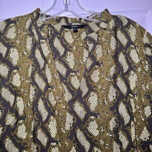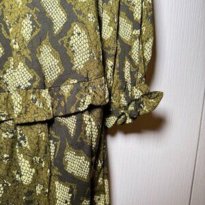 This is a stylish Next A-Line dress in olive green with a trendy snakeskin print. It features long sleeves, a V-neckline, and ruffle detail. The knee-length dress is made of 100% viscose material. It is suitable for casual, formal, and workwear occasions, and is a size 14 UK (size 10 US). Perfect for various seasons, this dress has a unique snakeskin print design that adds a fashionable touch.