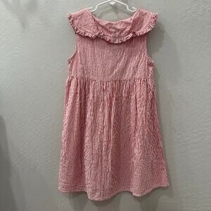 Next sleeveless dress size 7-8. Hot pink and white seersucker stripe with oversized ruffle collar and buttons down front of bodice. Super cute! Very good condition.