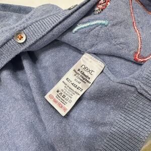 Next cardigan sweater size 9-12 months. Dusty blue with knit rainbow apples on front. Button up front. Super cute and soft! Very good condition - very minor wash wear.