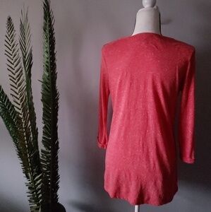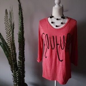 A nubby texture and "Couture" in black bead work, give this red tee a fun look. This tee features a deep scoop neck and 3/4 sleeves with a small cuff. Please note there is some slight pilling, but it is very hard to see due to the shirt's texture.
