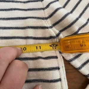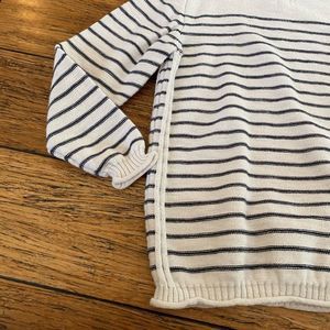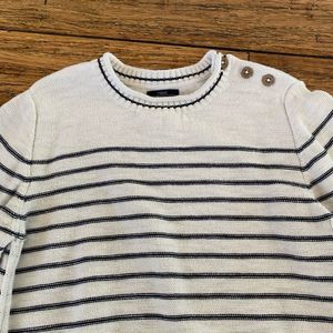 This is the perfect summer sweater. It’s light and soft, in classic cream with navy stripes and relaxed seams. Three wooden buttons at the shoulder are a great detail.