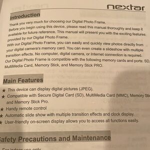 Nextar 7” digital photo frame N7-110 with black or silver frame and instructions. Requires SD card to display pictures.
