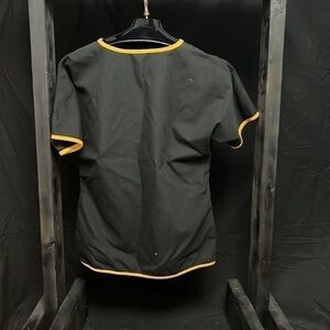 Size small. Polyester/cotton blend. Black shirt with gold trim and Steeler logo. Very good used condition.