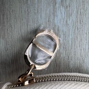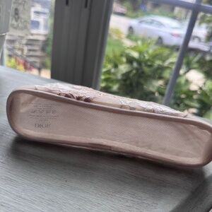 This Dior cosmetic bag showcases a sophisticated cream and gold color palette, enhanced by intricate embroidery featuring butterflies and floral motifs. The bag's dome shape and gold-toned 'CD' logo add a touch of elegance, making it a luxurious accessory for storing your beauty essentials.. Luxurious Dior cosmetic case with intricate cream and gold design. Perfect for stylish storage. Listing includes the Dior limited edition box. Approx. Measurements are 5.25"H/8"L/ 2"W.