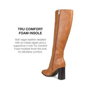 This Journee boot for wide-calf women is an essential classic. It boasts a 16-inch wide calf circumference, a 15-inch thigh-high shaft, and a 3.5-inch block heel. The boot features a Tru Comfort Foam insole, a square toe, and a side zipper, all crafted with faux leather. Measurements are approximate and based on size 6. Slight variations may occur