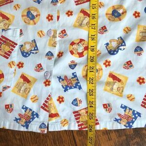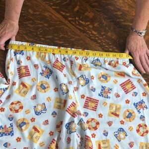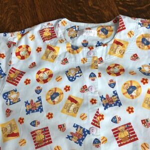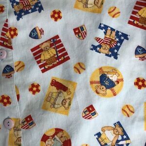 Darling shorts and top with cute bears doing sports on a light blue background. The fabric is a nice cotton or cotton blend that is brushed and feels a little like a super light flannel. Button front with one patch pocket and elastic waist on shorts. This set is listed as a large, but I’m listing it as a medium. Please check measurements. It is in like new condition. Width at bust 21” seam to seam laying flat. Waist 21”. Length 26”. Width at waist 12-18”. Hip 21.5”.