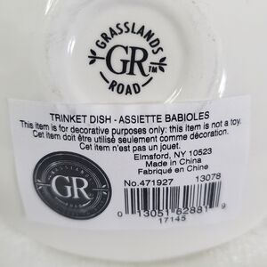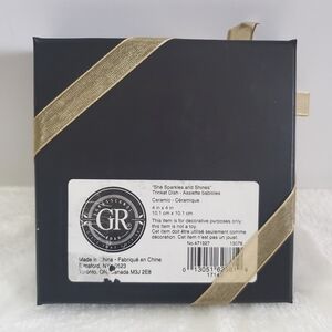NIB Grasslands Road She Sparkles She Shines Aunt Ceramic Gold Trinket Dish. 4" x 4" circle shaped ceramic dish, white with gold accents, black writing image, rectangular ceramic "Aunt" tag, wrapped in a gold ribbon. Great for gift giving! Brand new in box!