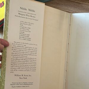 Nibble Nibble. Poems for children. By Margaret Wise Brown. No markings except for name in picture. Book jacket is in good condition. Some wear from age but no markings or tears. Some discoloration from age