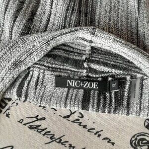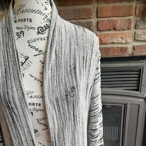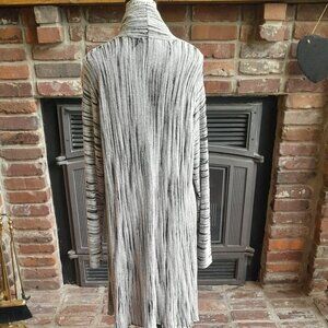 Nic + Zoe Cardigan Gently Loved if at all. XL This is a fabulous Greyish white and black Duster. The Black is see-through giving it a more textured look. Approx. Measurements: Length 39" 24" Pit to Pit Back of cardigan and Arm length from shoulder seam 27" to cuff. Pet Friendly Home
