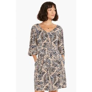 A relaxed fitting A-line with a print inspired by tropical fronds and meant to be worn outdoors on the season's hottest days. Soak up the sun with the short, but not too short, hem designed to sit above the knee. We gave the silhouette soft volume sleeves with fabric gathers at the sleeve to create texture and add flair and breeziness to the silhouette. Some stretch woven in creates a flattering, all-day comfortable feel.