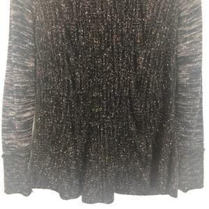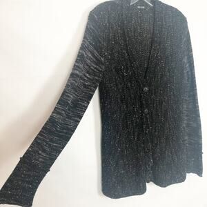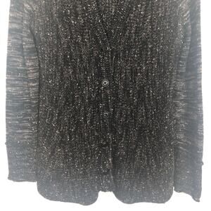 Nic + Zoe women's knit marled cardigan. Black, white, and gold. V-neck. Button down. Contrasting space-dye long sleeves. Flared hem in back. In good used condition. No visible flaws.