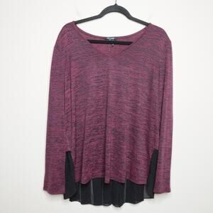 A pleated shirttail panel of airy chiffon gives a pretty flutter to a cozy knit top that's ideal for the season's casual get-togethers. V-neck. Long sleeves.