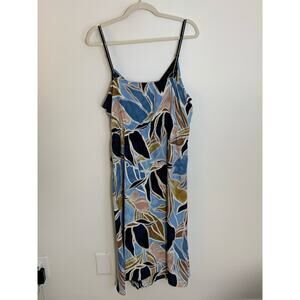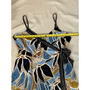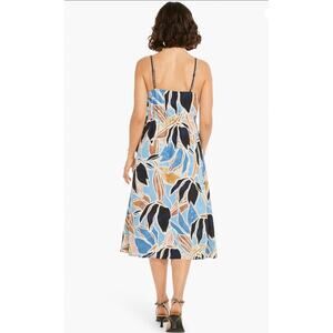 A new silhouette that we just can't get enough of. This faux wrap dress (you pull it on like any other) features our prints of the season: a placed print swirl of blues and neutrals plus the elevating influence of black and white striping along the wrap edge. It also features a usable tie, adjustable straps, and easy elastic at the back. We made it sleeveless with a fitted shape and designed the hem to fall below the knee
