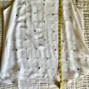 Nic+Zoe chiffon like material in a loose sleeveless v-neck top. White with small embroidered medallions in blue and green hues. Back chiffon has a split opening for flowy effect. Easy care 100% polyester. In excellent condition. See photos for measurements.